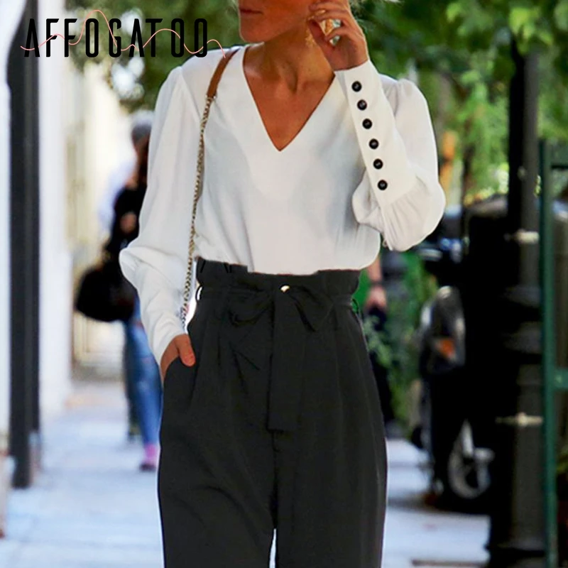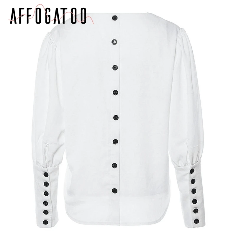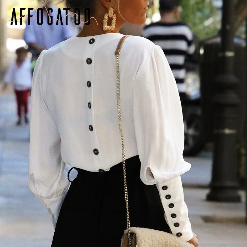 Buy Affogatoo Puff sleeve women blouse shirt Button white v neck tops spring 2019 Elegant office lady s