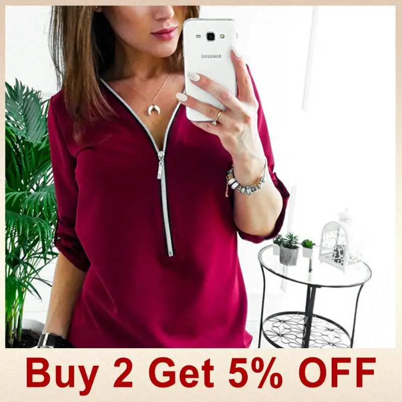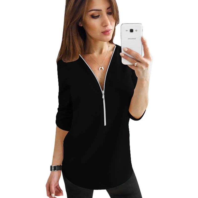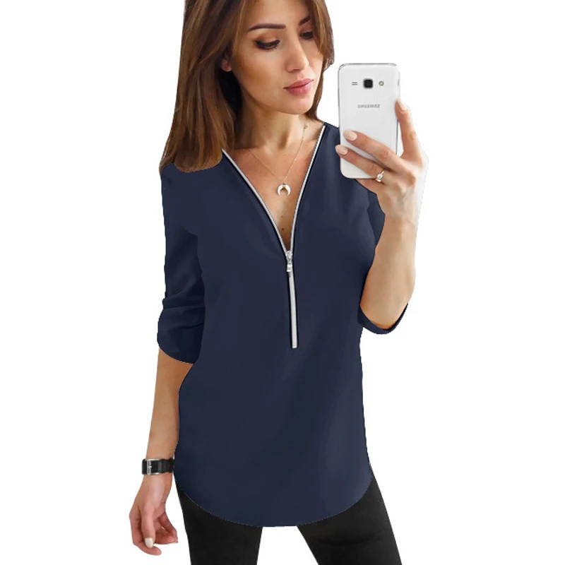 Best Women Spring Summer Chiffon Blouse Top 2019 V Collar Zipper Roll Up Long Sleeves Loose Shirt Blusa