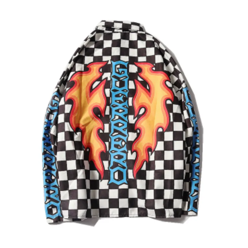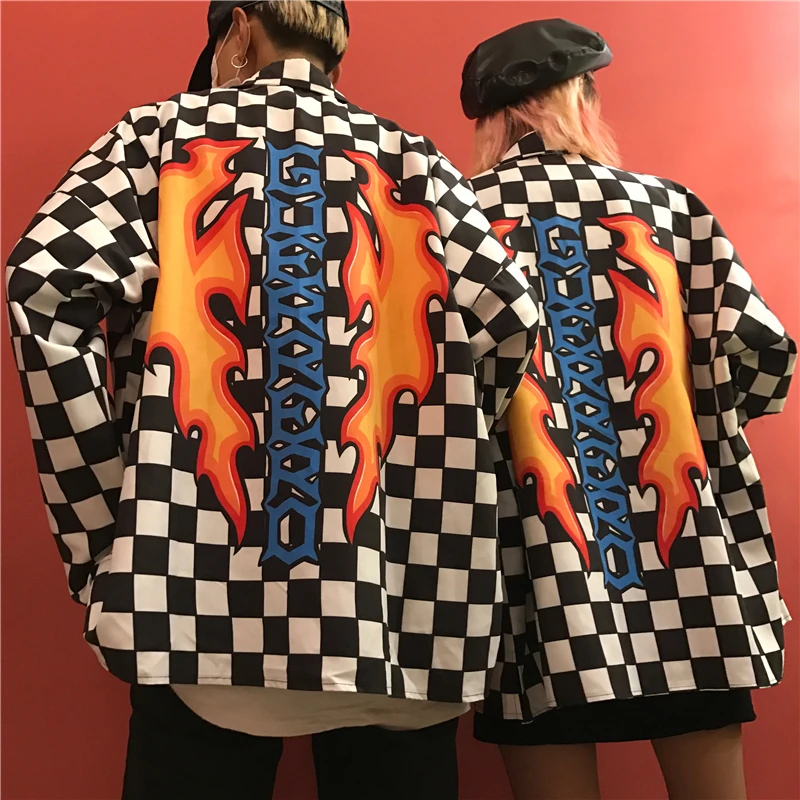 Promo Harajuku retro black and white Plaid shirt flame check Blouses Cardigan Unisex Couples Single-breas