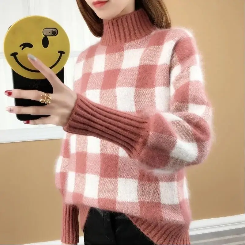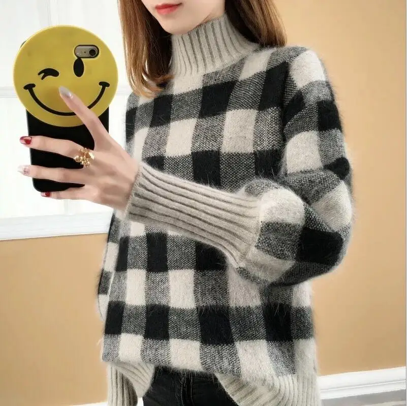 Promo 2019 Autumn Winter Women Plaid Knitted Sweater Long Sleeve High Neck Sweater Casual Pullover Jumper
