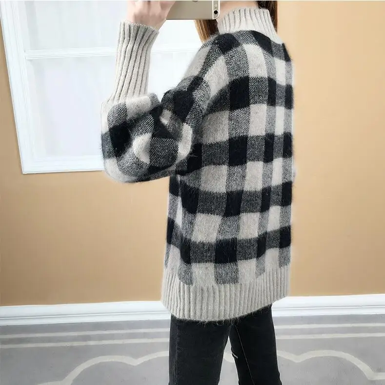 Best 2019 Autumn Winter Women Plaid Knitted Sweater Long Sleeve High Neck Sweater Casual Pullover Jumper