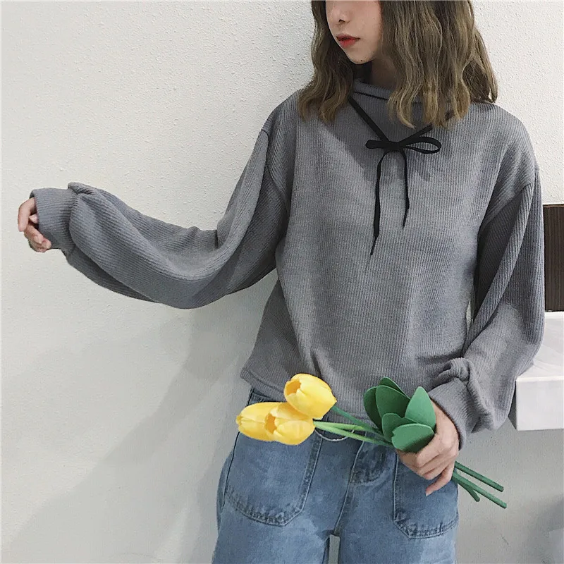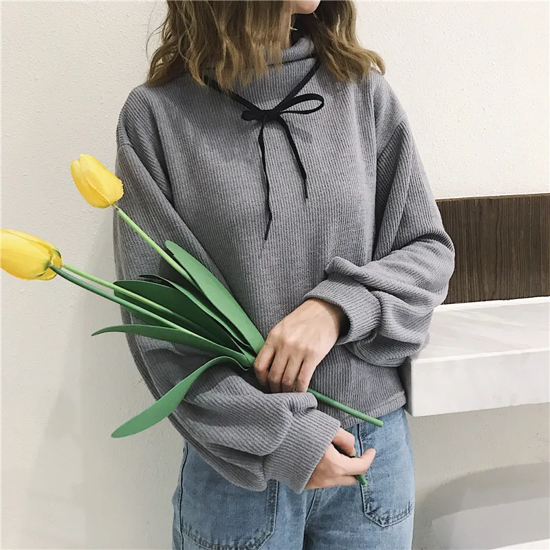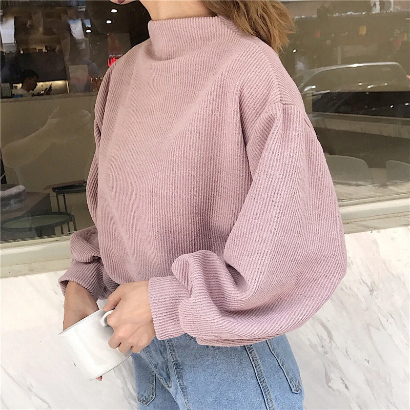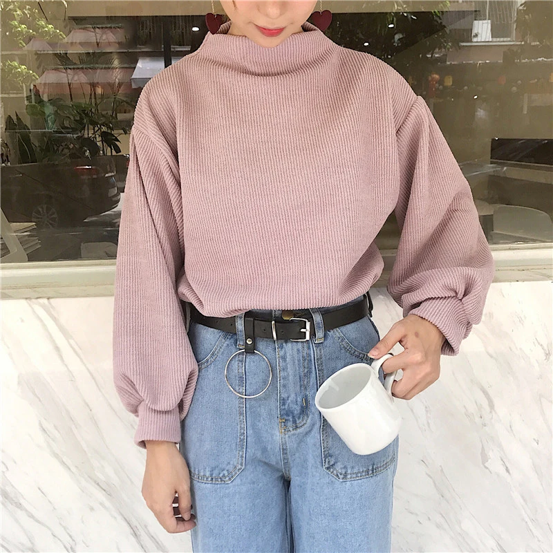 Promo Hoodies Women Solid Ladies Elegant Turtleneck Puff Sleeve Simple All-match Korean Style Kawaii Swea