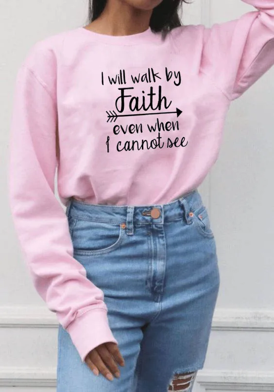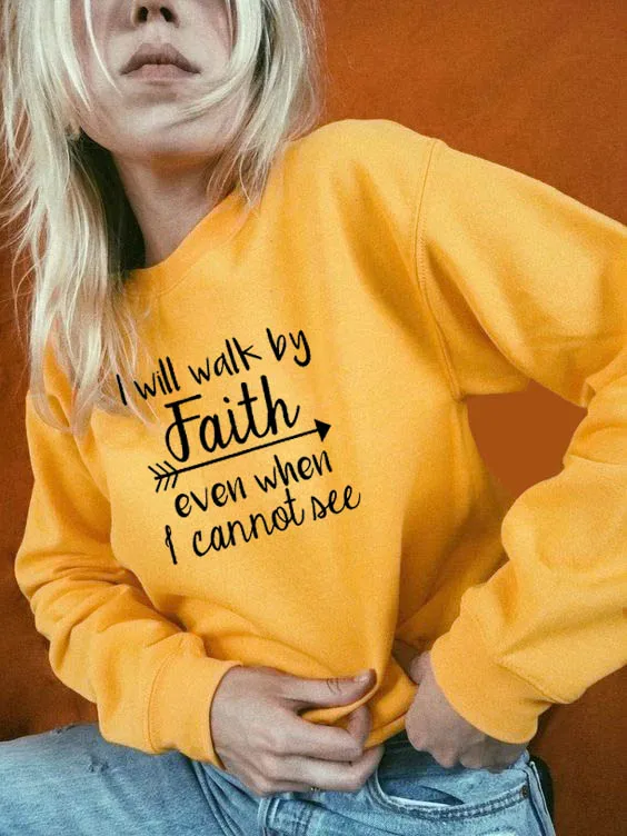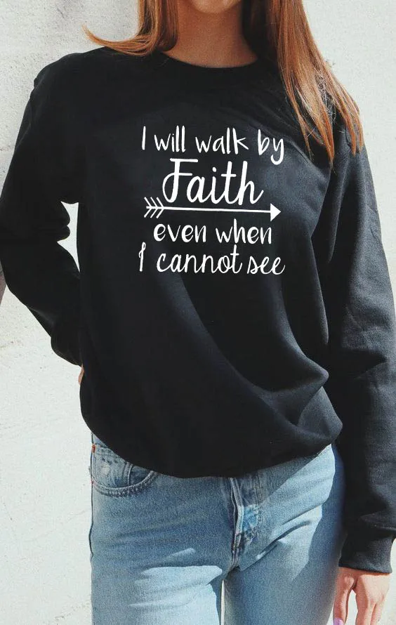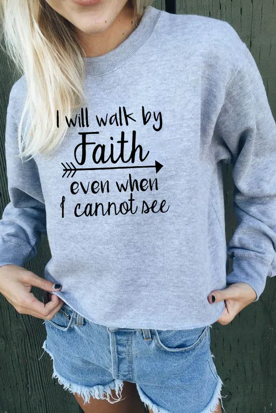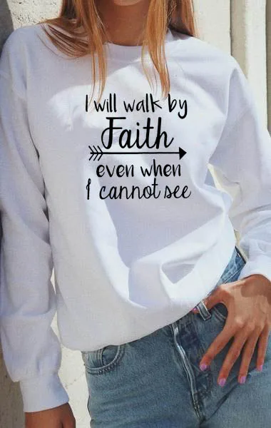 New Sweatshirt I Will Walk by Faith Printed New Arrival Women's Funny Long Sleeve Casual 100%Cotton Top