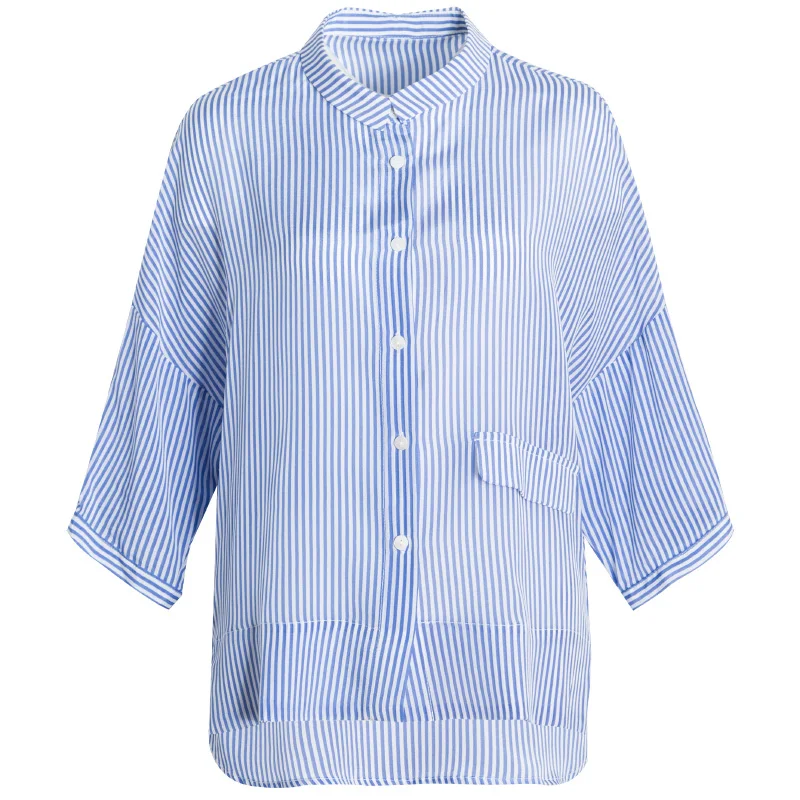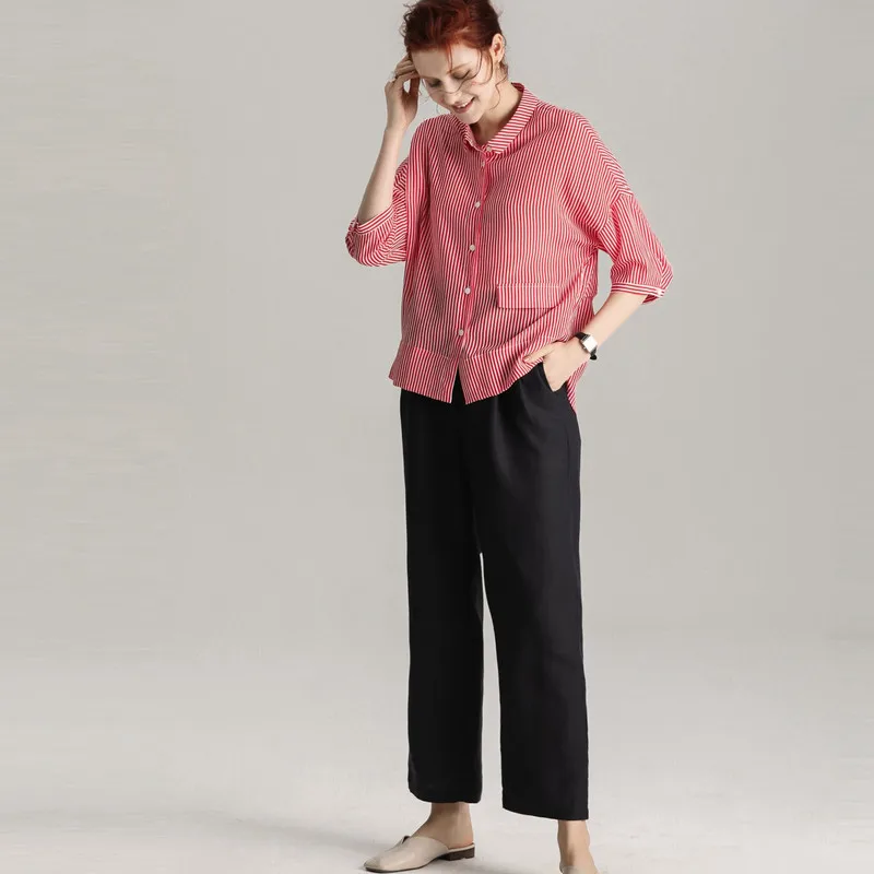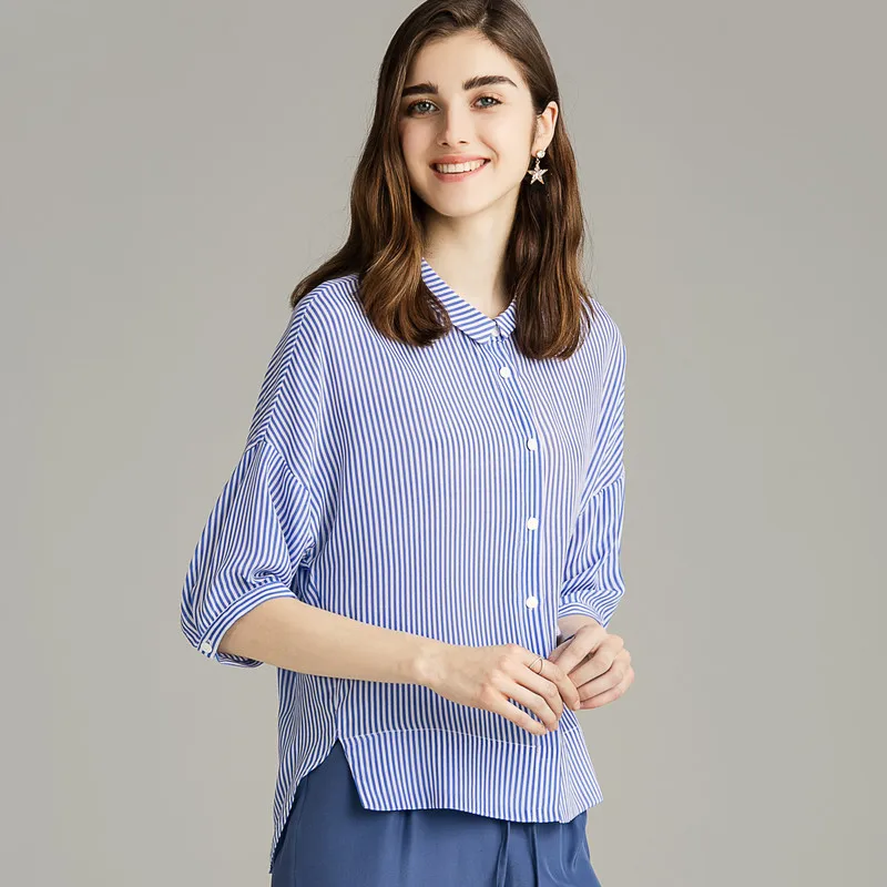 New Women Stripe Blouse 100%Real Silk Crepe Printed Half Sleeved Blouse Shirt for Women 2019 New Stripe