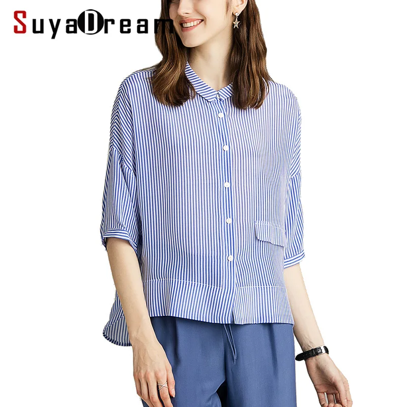 Promo Women Stripe Blouse 100%Real Silk Crepe Printed Half Sleeved Blouse Shirt for Women 2019 New Stripe
