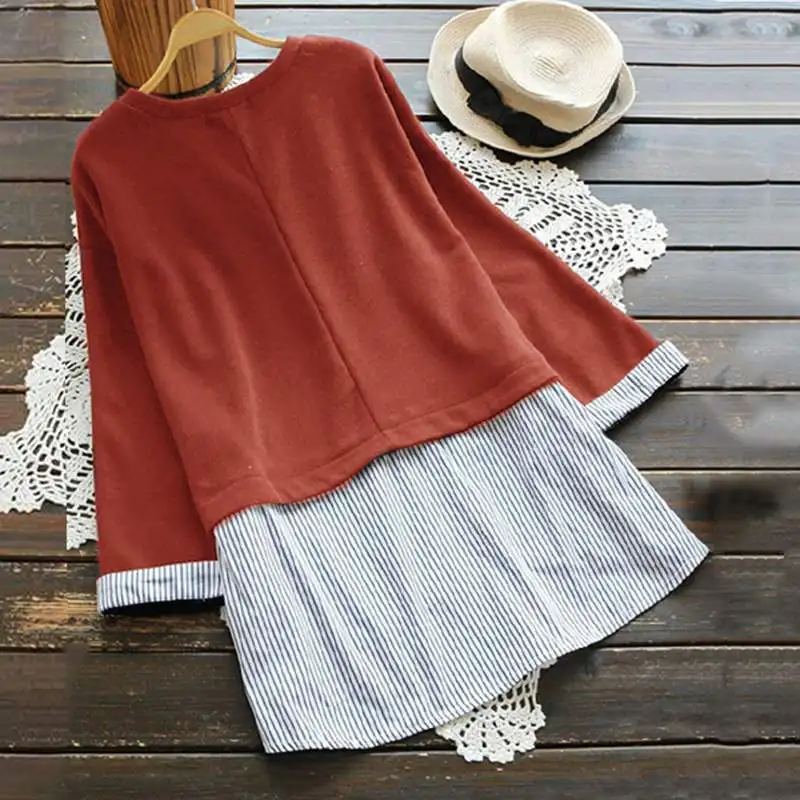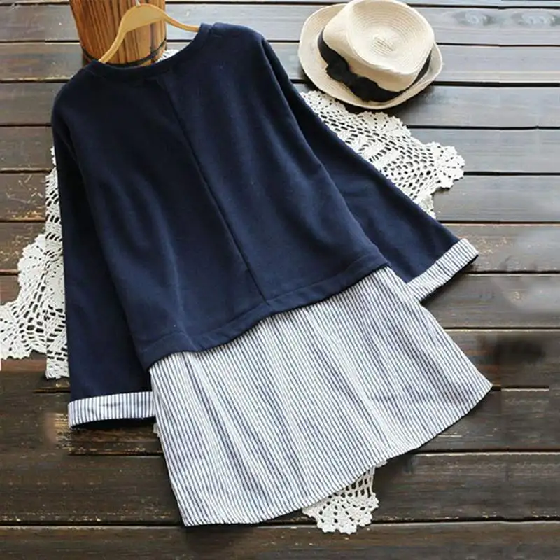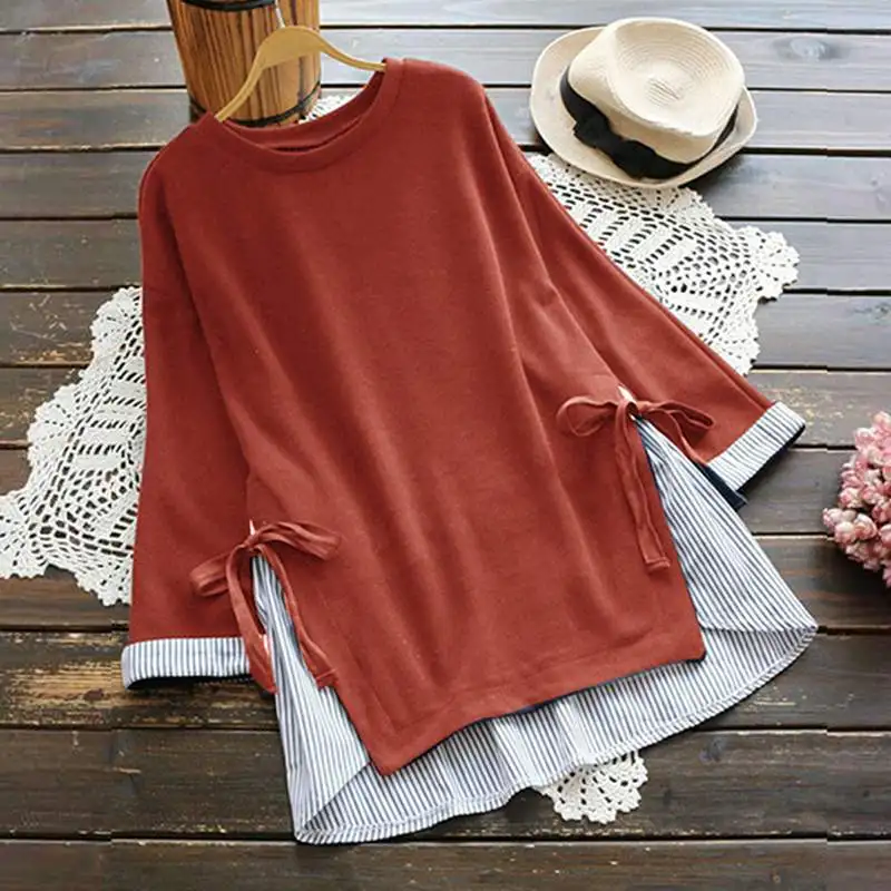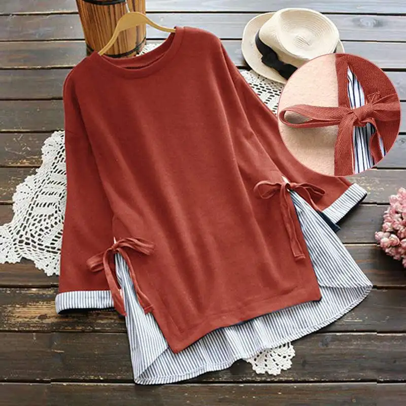 Promo Fake Two Pieces Shirt Women Blouse Patchwork Striped Side Straps Loose Shirts Ladies Casual Blusas